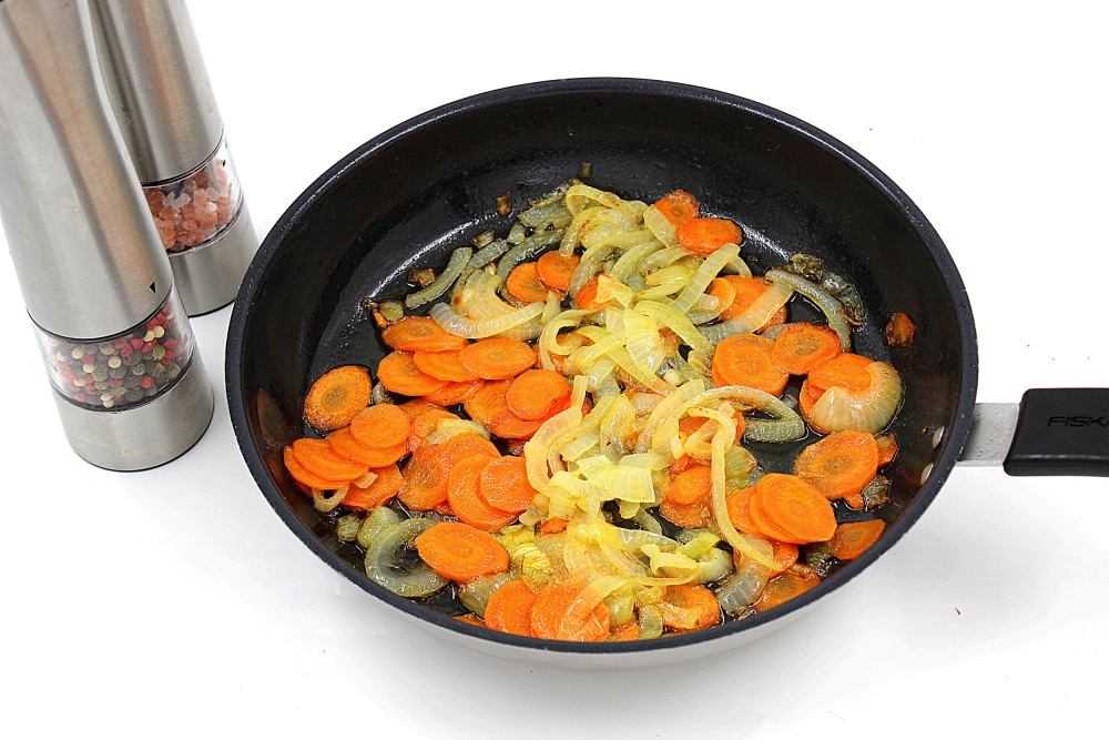 Растопить 50 г сливочного масла и обжаривать примерно 5-7 минут морковь с луком, на среднем огне, до мягкости моркови.