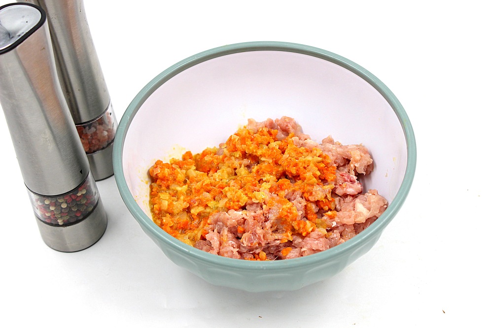 Прокрутить через мясорубку куриные бедрышки и жареные морковь с луком.