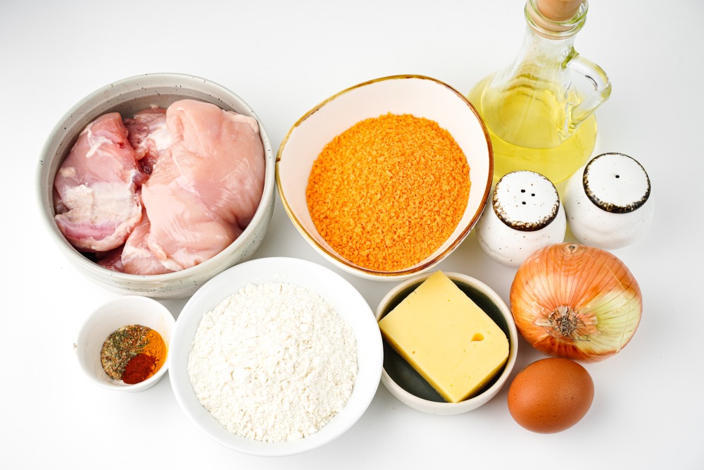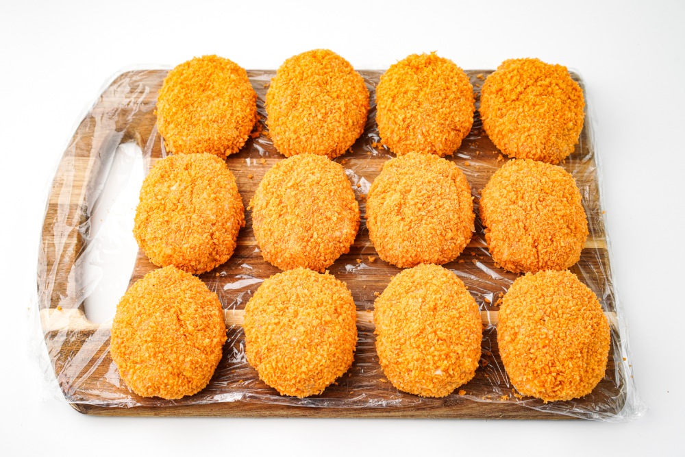 Подготовить ингредиенты для куриных котлет в панировке для заморозки.