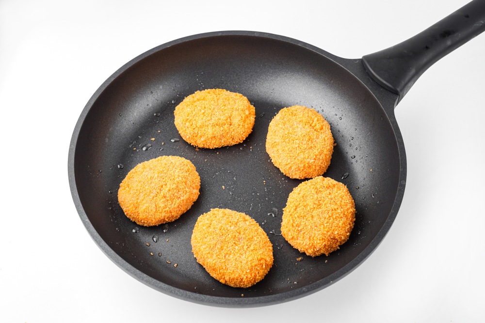 Для приготовления разогреть сковороду на среднем огне, добавить немного растительного масла. Обжарить котлеты с одной стороны 6-8 минут.