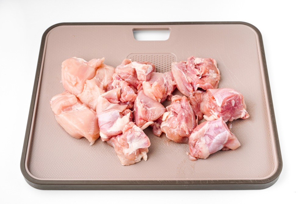 Нарезать курицу на крупные куски, удобные для измельчения.