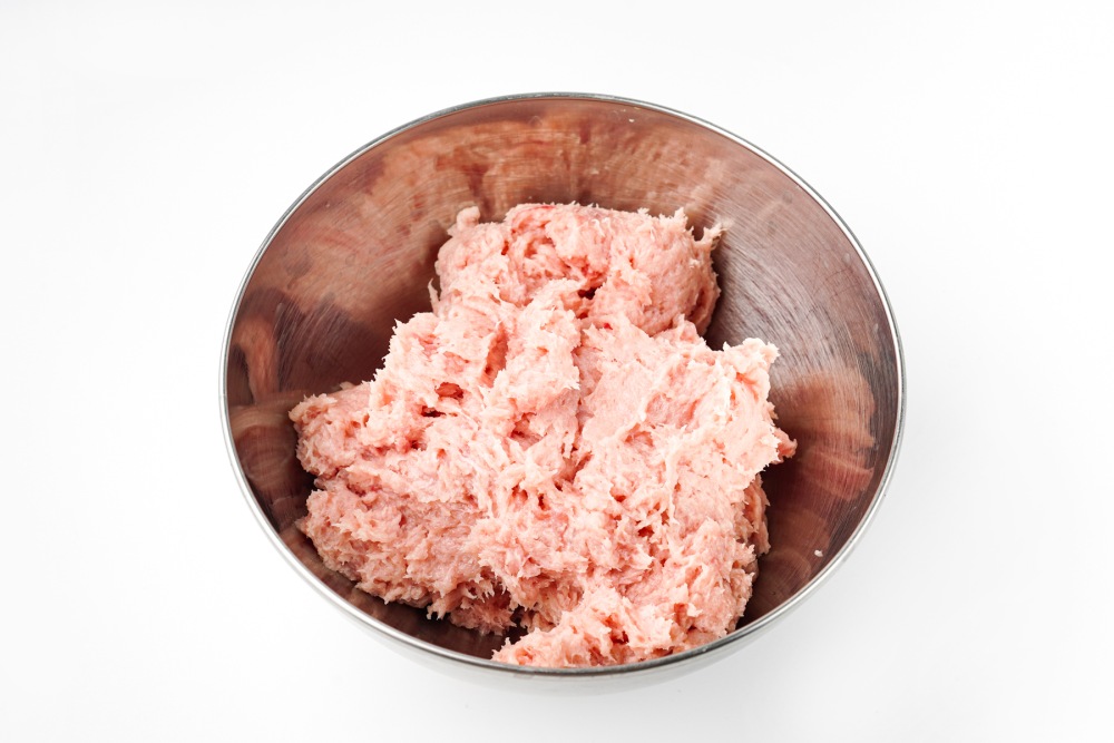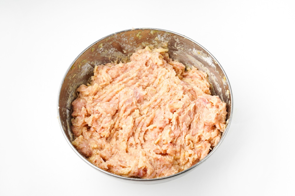Поместить курицу в блендер или пропустить через мясорубку. Добавить чайную ложку соли и измельчить до однородного фарша. Переложить фарш в глубокую миску.