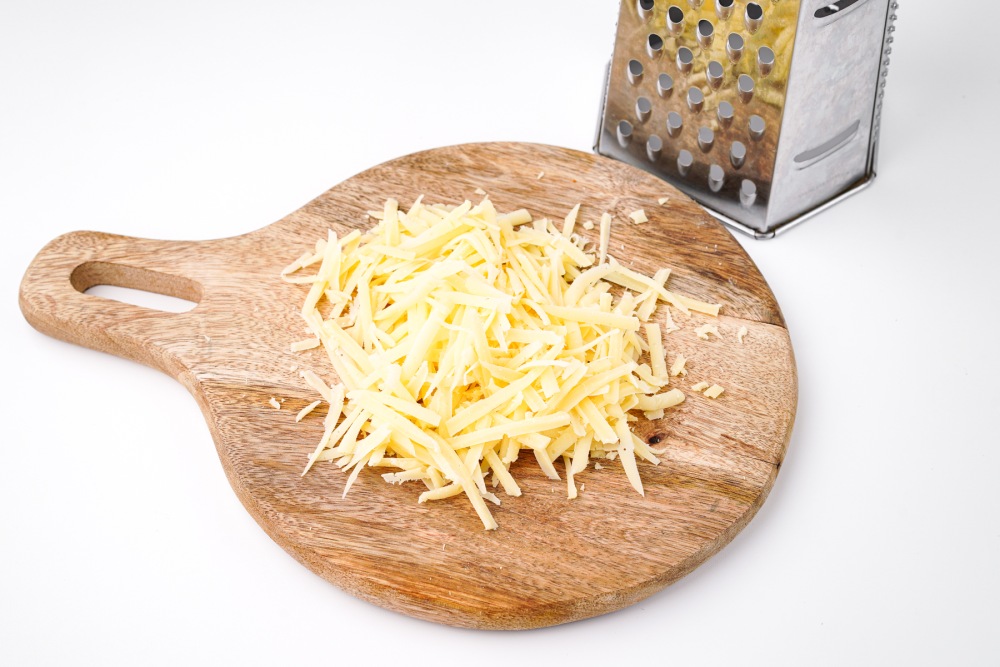 Натереть твёрдый сыр на средней тёрке. Сыр должен быть не слишком мелким, чтобы он ощущался внутри котлет.