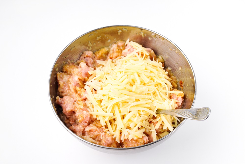 Всыпать тёртый сыр в миску и хорошо перемешать, чтобы он равномерно распределился по всей массе.