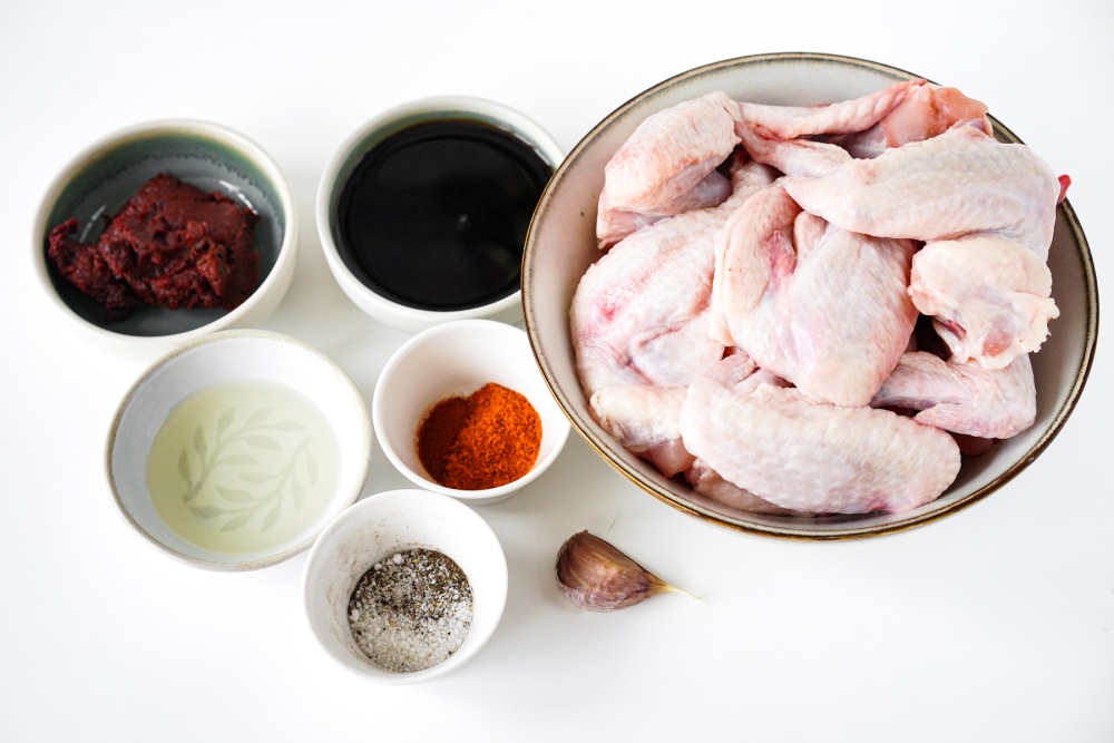 Подготовить ингредиенты. Крылышки можно использовать целиком или только их мясистую часть - локтевую и плечевую. Именно там больше мяса, и они получаются особенно сочными. Аджику по желанию заменить на кетчуп или томатную пасту - это придаст крылышкам мягкий, сбалансированный вкус. Специи подбирать по своему вкусу: паприка и куркума дадут насыщенный цвет, сушёные травы - аромат, а чеснок - лёгкую пряность.