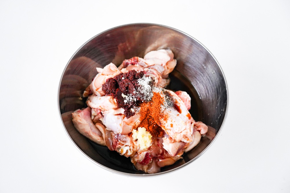 В глубокой миске соединить крылышки и маринад: соевый соус, аджику, растительное масло, паприку, куркуму, сушёные травы, выдавленный через пресс чеснок, соль и перец.