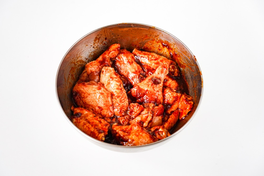 Всё тщательно перемешать до однородности руками или ложкой, чтобы маринад равномерно покрыл каждое крылышко.