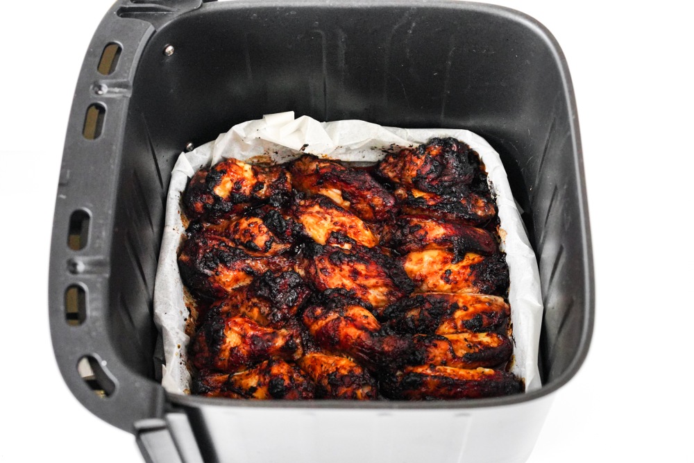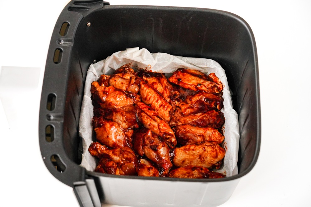 Разогреть аэрогриль до 190 °C. Решётку слегка смазать растительным маслом или застелить пергаментом с отверстиями - так жир будет стекать вниз, а мясо не прилипнет. Разместить крылышки в один слой. Если хотите равномерную корочку со всех сторон, оставляйте между ними небольшое расстояние. Если нужно приготовить всё сразу, можно выложить плотнее, но корочка получится в основном сверху.