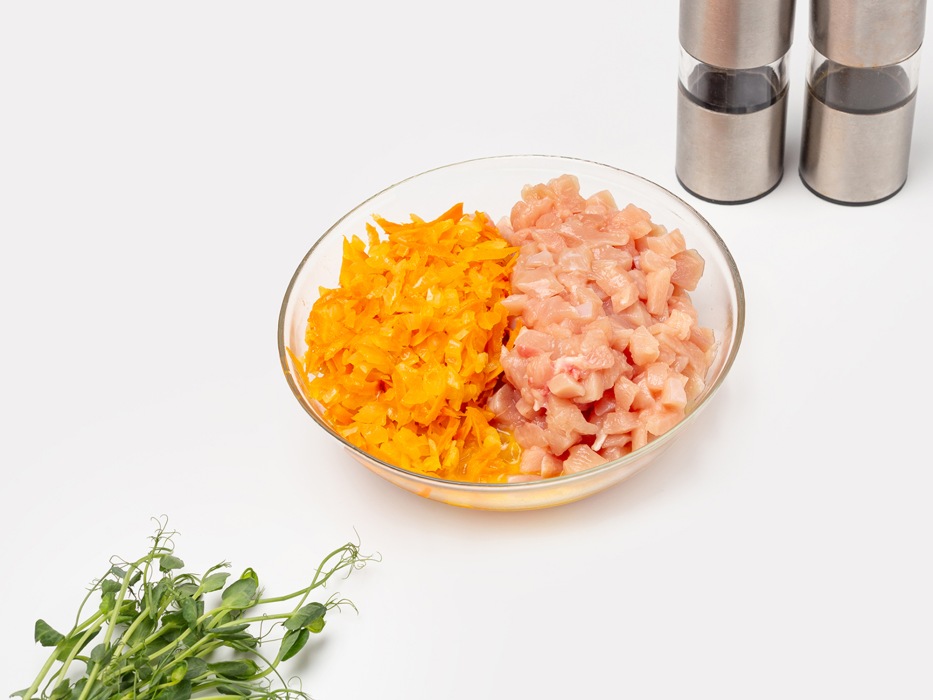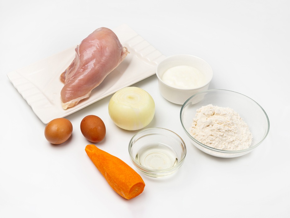 Подготовить все продукты: куриное филе промыть, просушить. Для отбивных и котлет я всегда использую куриную грудку. Несмотря на то, что она в других блюдах суховата, в этих оладьях грудка получается очень сочной. Морковь выбирайте среднего размера, чтобы ее было не слишком много, иначе вкус овощей будет перекрывать нежный вкус грудки.