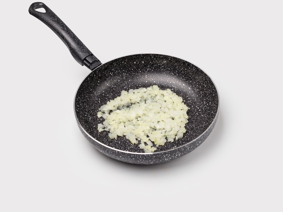 Растительное масло разогреть на сковороде на среднем огне. Обжарить лук до золотистого цвета, не забывая помешивать.