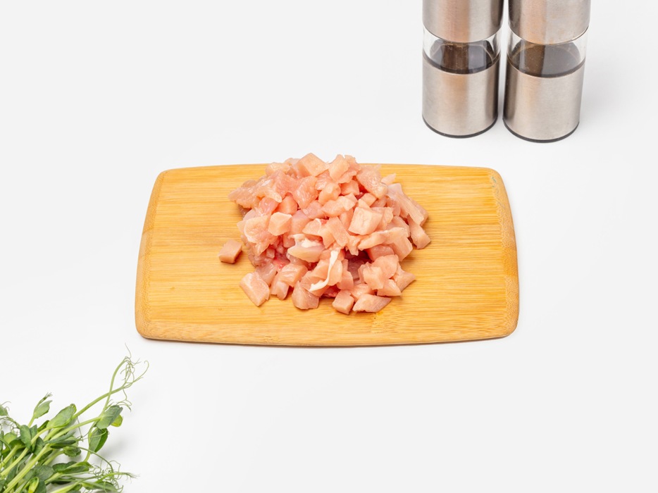 Куриное филе нарезать кусочками. Я предпочитаю грудку. Её очень легко нарезать. Кусочки старайтесь нарезать как можно мельче. Так оладьи будут таять во рту и блюдо получится очень нежным.