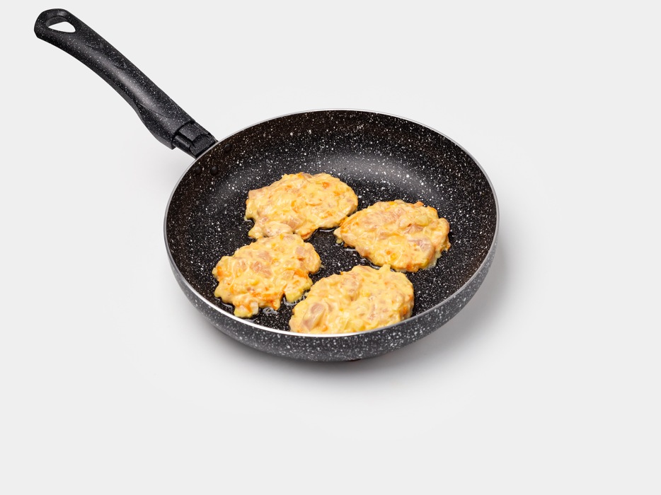 Перевернуть куриные оладьи с овощами и обжарить еще в течение 5 минут с другой стороны. Из полученного теста получится примерно 11 оладий.