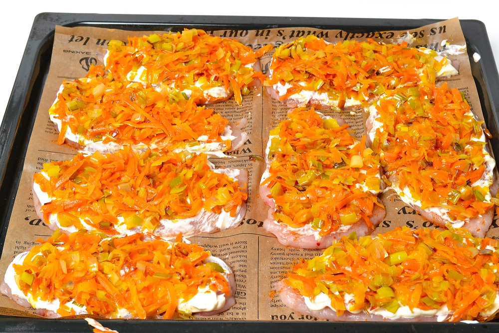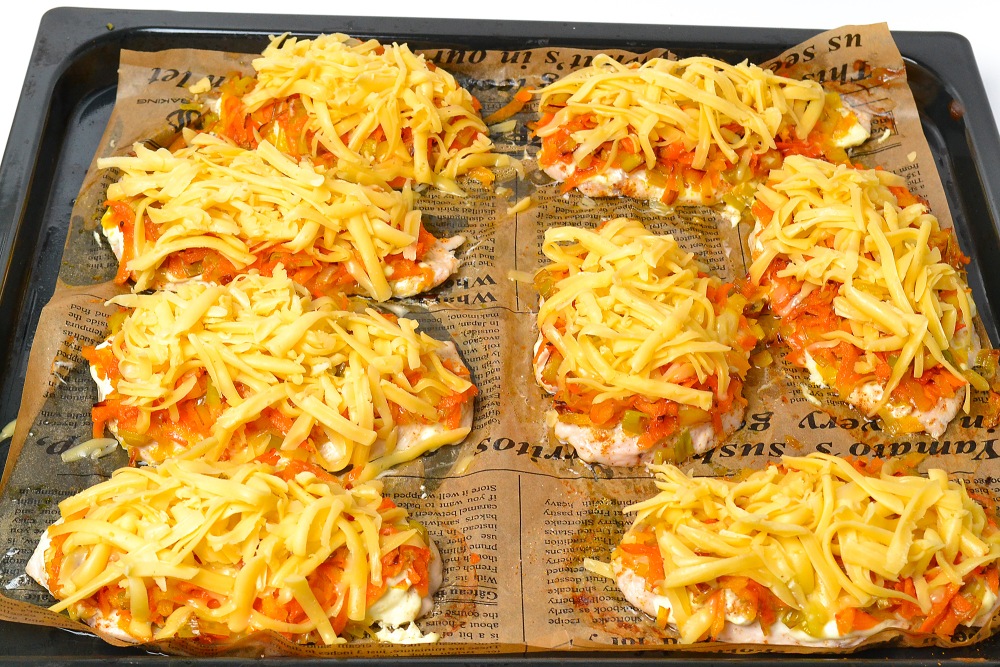Мясо получается сочным, вкусным, а морковь с луком идеально дополняют его мягкостью и ароматом овощей. И, конечно же, сыр. Достаточно совсем чуть-чуть, чтобы сохранить идеальный баланс. Подать такое блюдо можно на обед или на ужин. И даже на праздничный стол, ведь смотрится оно превосходно.