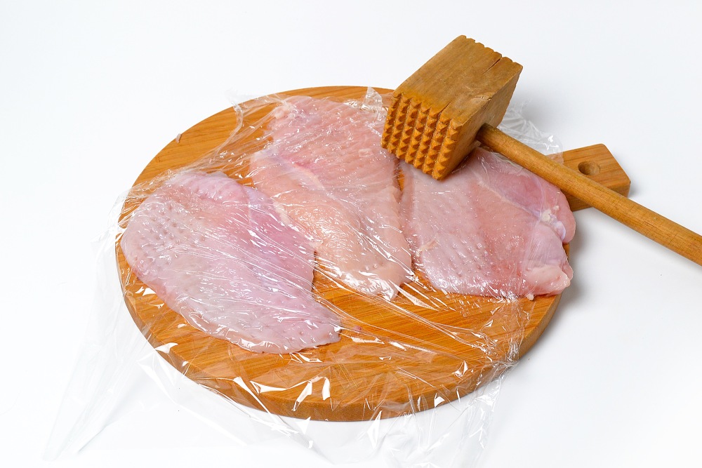 Совет: используйте пакет или пищевую пленку, чтобы не летели брызги и мясо не рвалось.