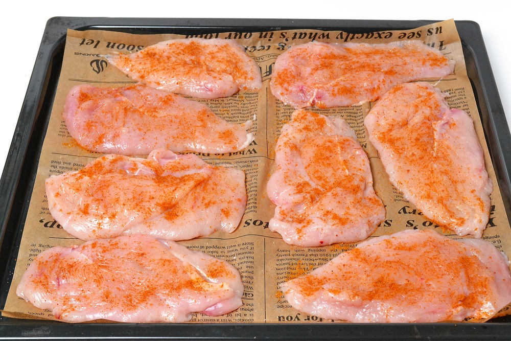– При использовании приправ «Для курицы» учитывайте наличие в них соли и не присаливайте грудки дополнительно.