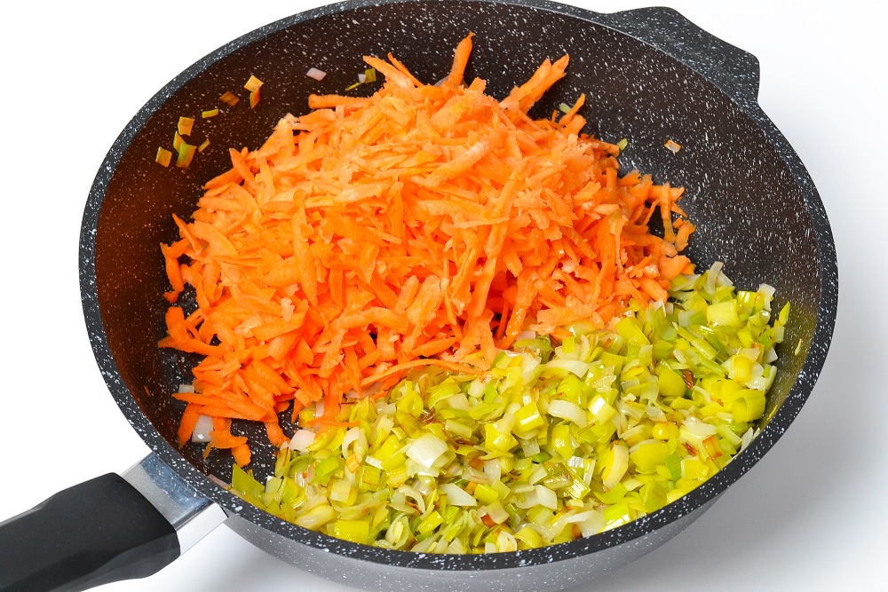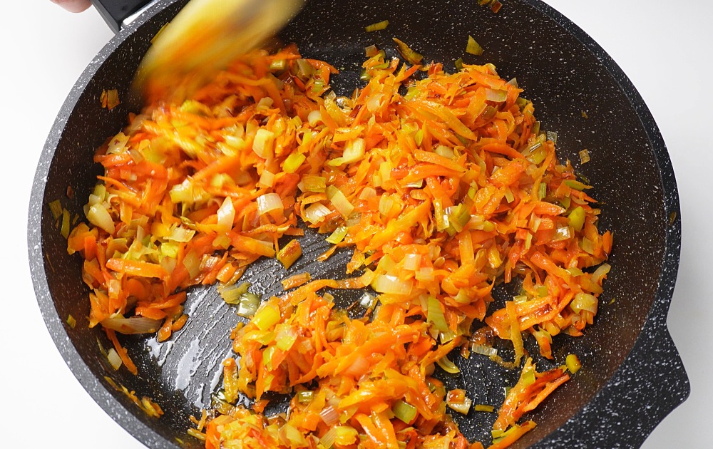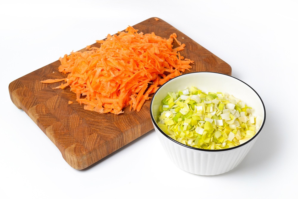 Морковь – еще один важный ингредиент, который можно заменить тыквой с умеренной сладостью. В рецепте я использую лук-порей, но подойдет любой другой лук.
