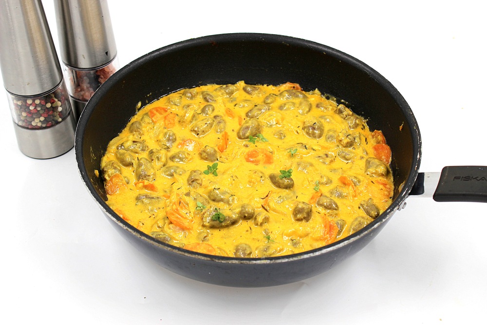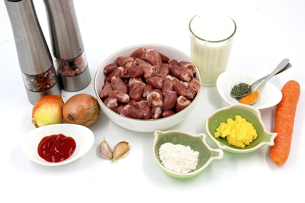 В иерархии субпродуктов сердечки, на мой взгляд, являются одними из самых незаслуженно недооцененных. А ведь это дёшево, просто в приготовлении и действительно вкусно. Благодаря куркуме и тимьяну наше блюдо приобретет особый, выразительный вкус, а густой соус придает ему приятную нежность.