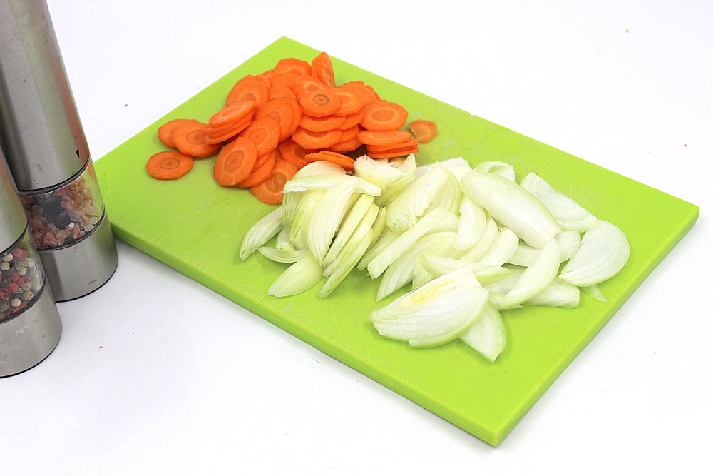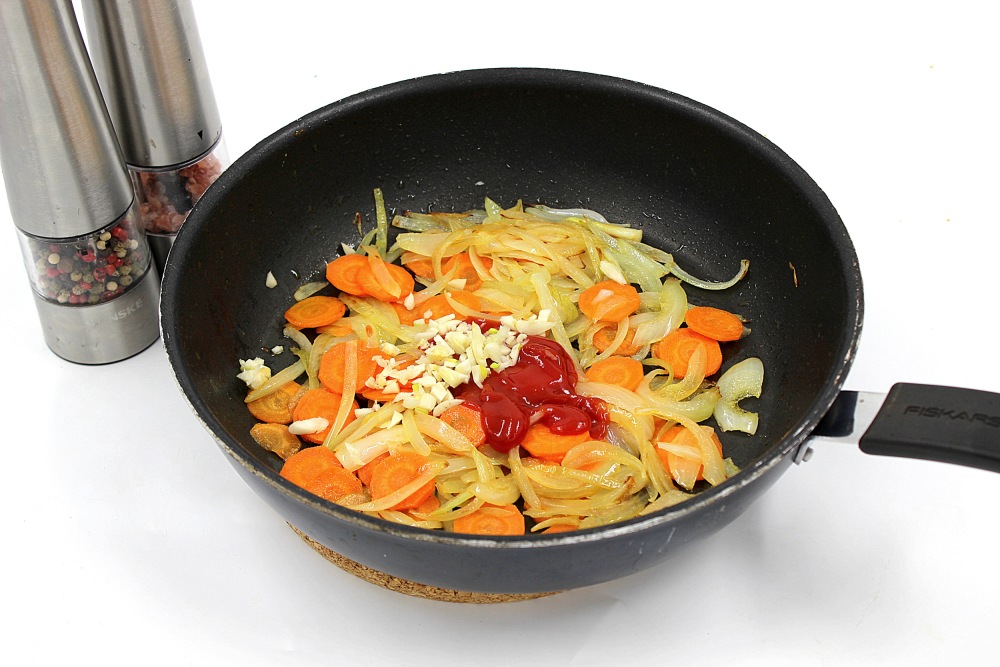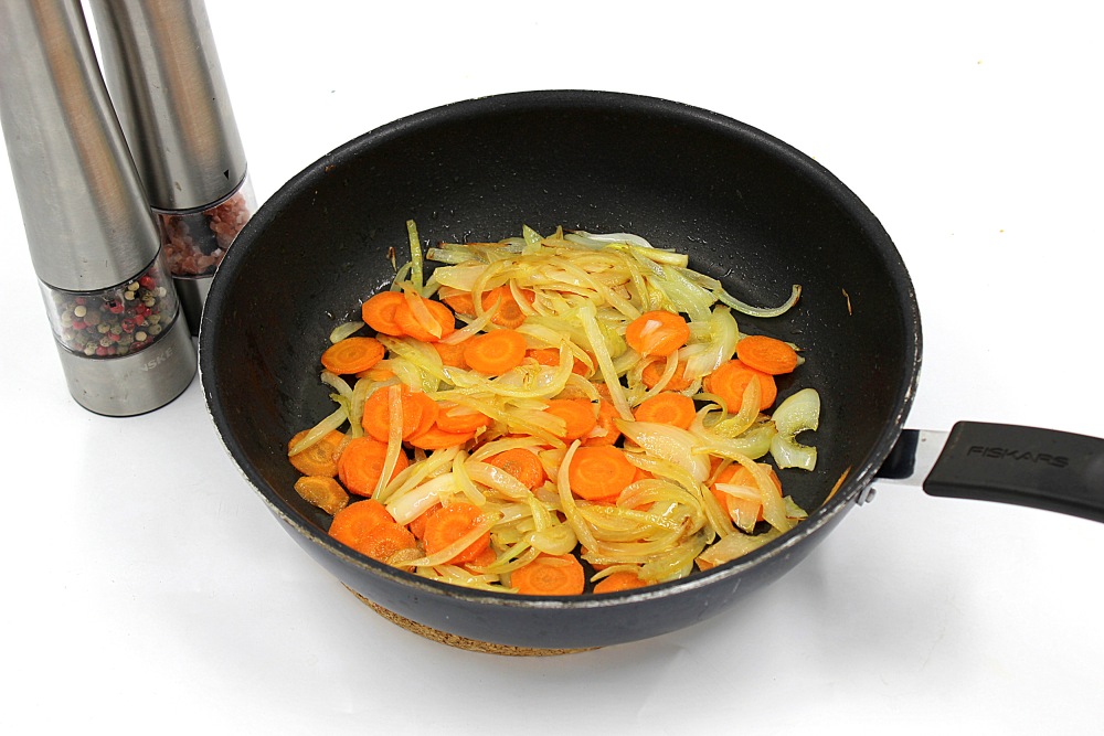 А тем временем обжарить на масле лук, около 2 минут, добавить морковь и продолжить обжарку еще на пару минут.