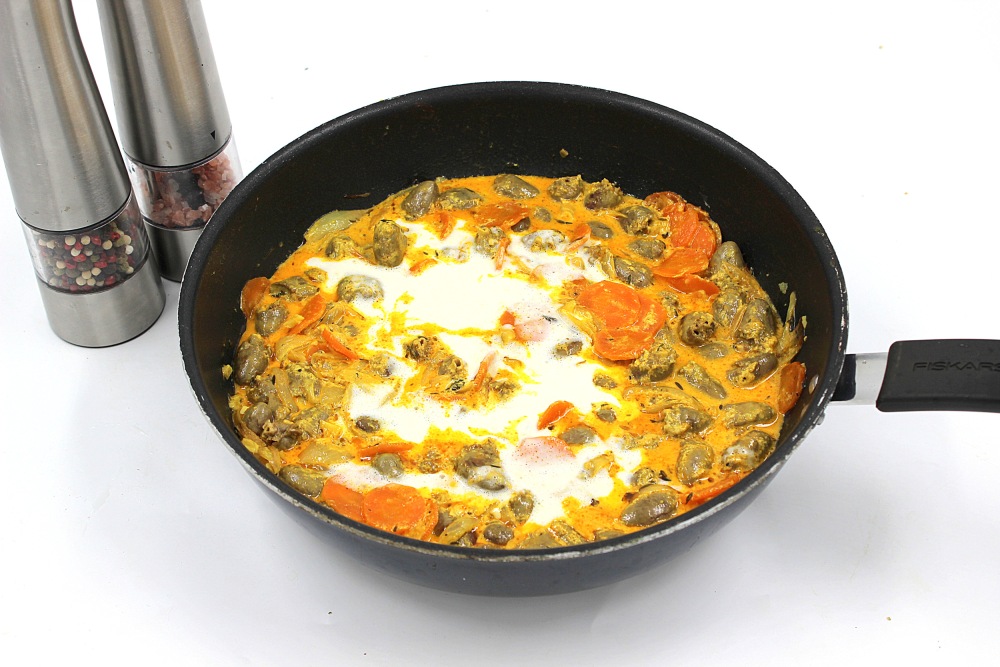 Отлить 50 грамм сливок и примешать муку. Остальные 200 г влить в сковороду, добавить куркуму, посолить и поперчить.
