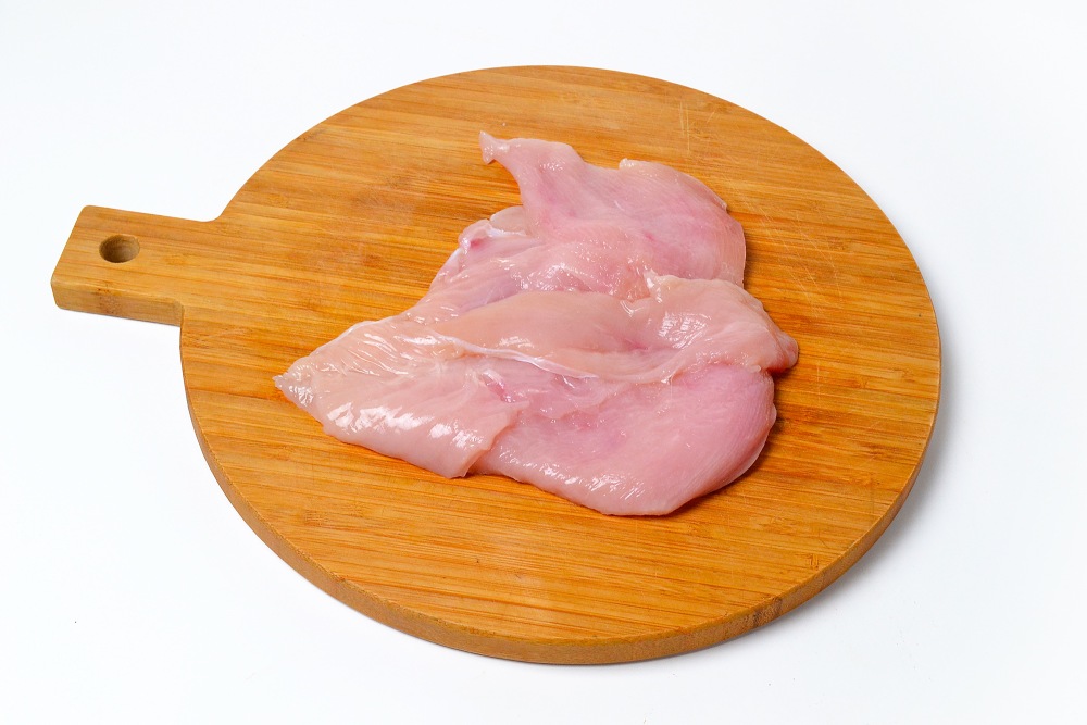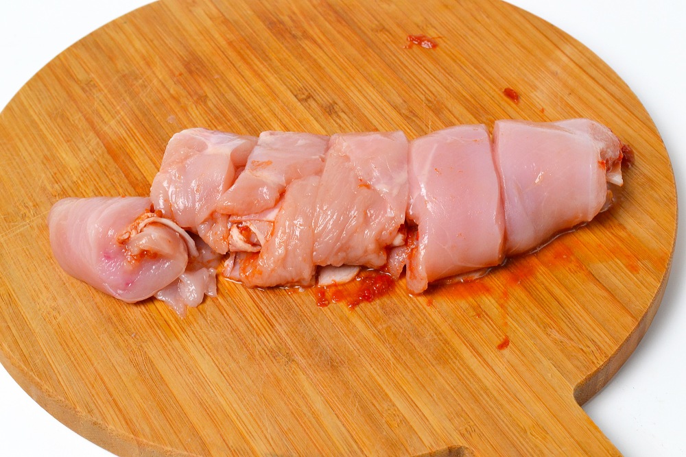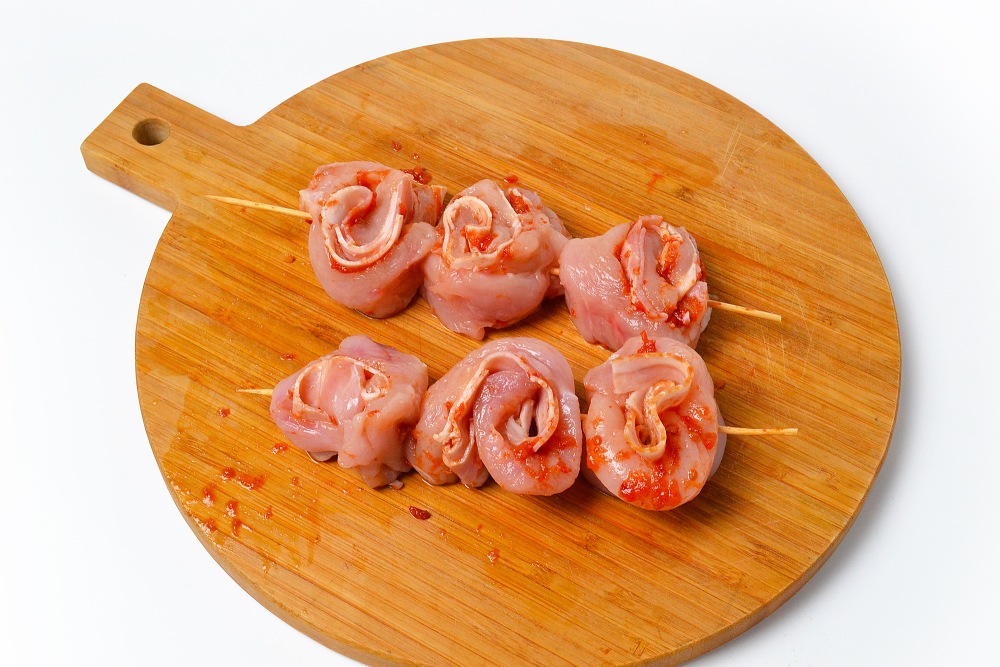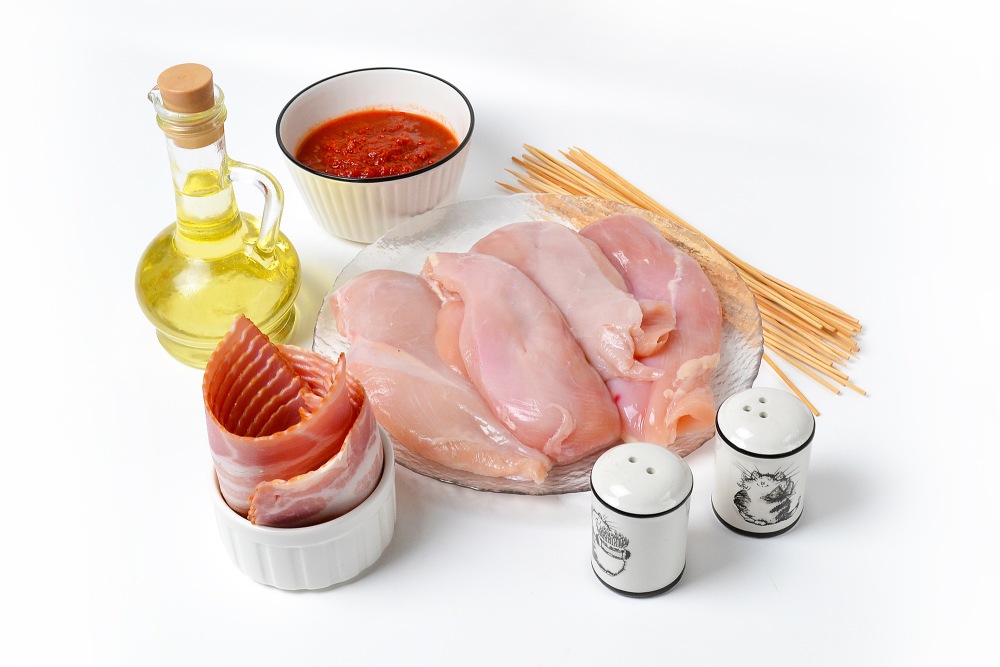 Подготовить ингредиенты: филе разморозить заранее, но не до конца. Слегка подмороженное филе легче разрезать вдоль для разворота. Выбирать следует грудки среднего или большого размера, так как из маленьких скручивать рулеты не очень удобно. Из 2 филе среднего размера получается не более 5 куриных шашлычков с беконом, если нанизывать по 3 «колечка».