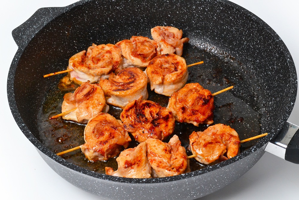 Совет: ориентируйтесь на размер сковороды, при необходимости шпажки можно обрезать до нужной длины. Сковороду лучше брать самую большую.