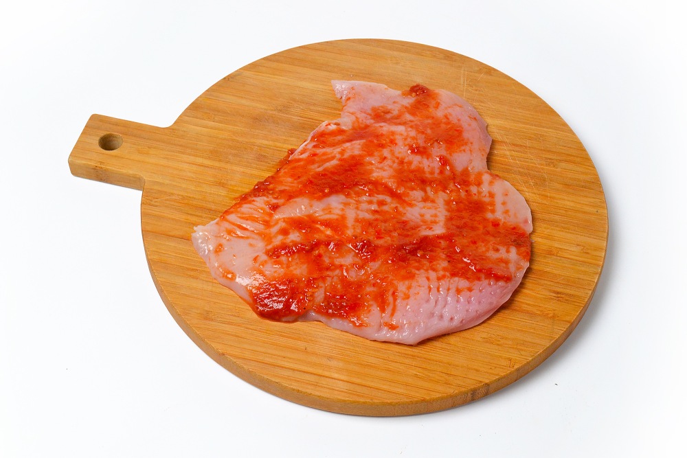 Смазать разворот томатным соусом. Если используете пасту, то предварительно филе следует посолить, поперчить, а пасту смешать с измельченным чесноком.