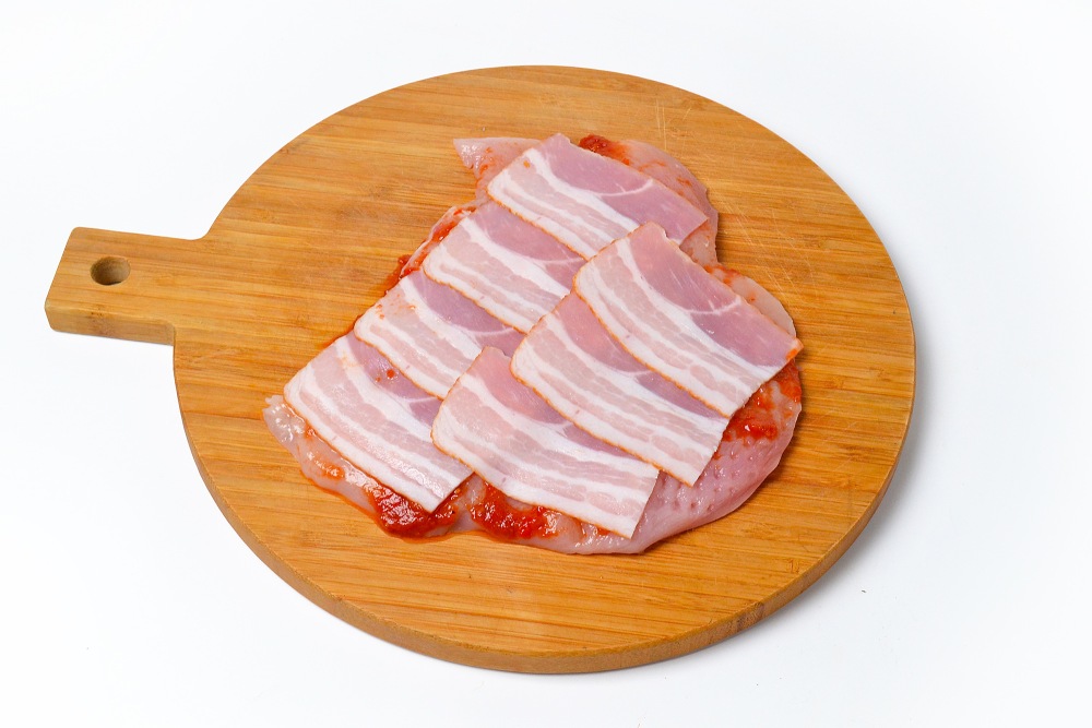 Бекон лучше взять в виде нарезки – у него одинаковая толщина и очень тонкие ломтики. Варено-копченый или сырокопченый – особой роли не играет, выбирайте по своему вкусу.
