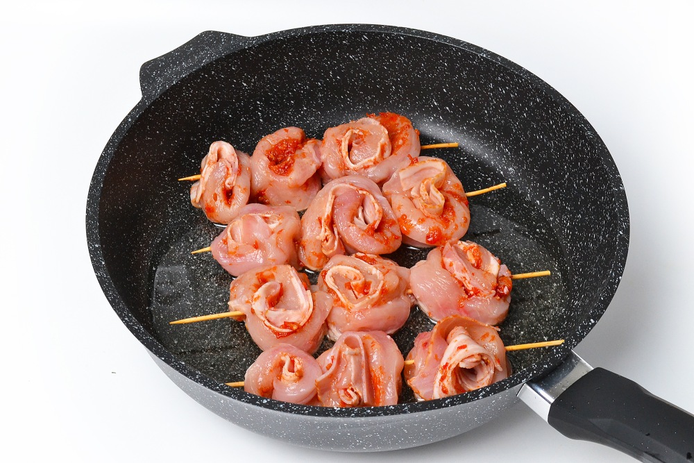 – Не жарить нарезанные рулеты без бамбуковых шпажек или зубочисток – они раскрутятся.