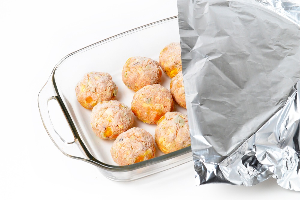 В день приготовления достать тефтели, выложить в форму и накрыть фольгой. Запекать 50 минут при 220 градусах на среднем уровне.