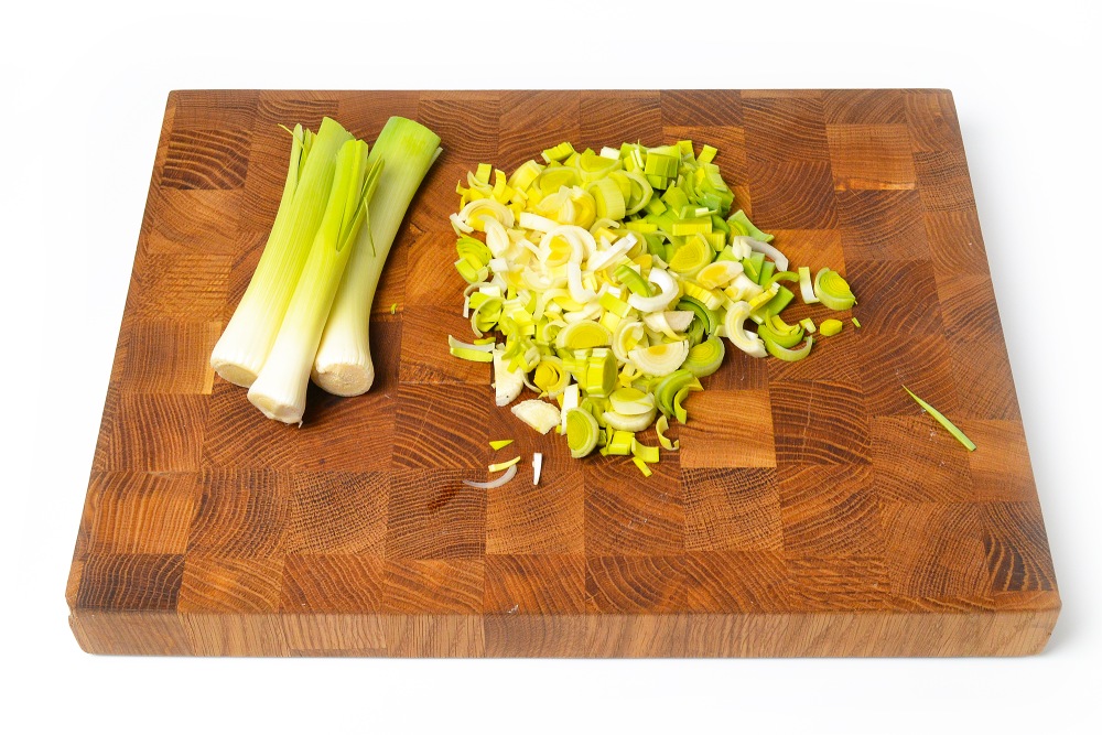 Лук-порей нарезать кубиками или полукольцами.