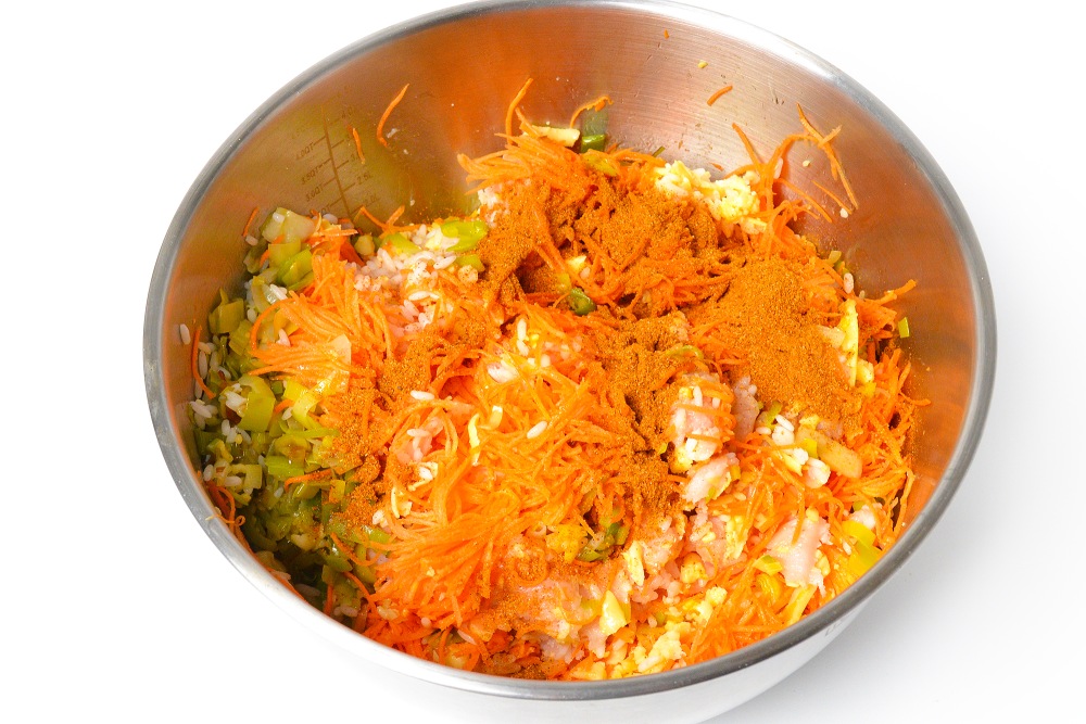 Смешать лук, морковь, сыр и мясо в миске, добавить рис.
