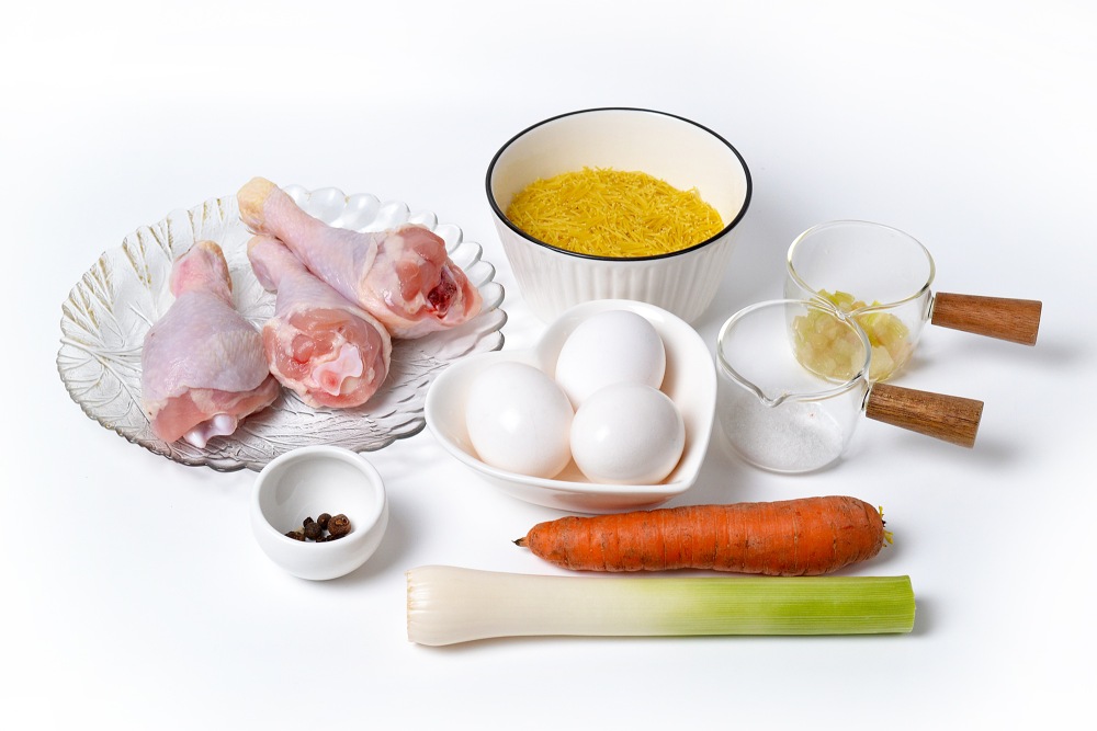 Подготовить ингредиенты: курицу, морковь, лук, перец горошком, соль, вермишель и яйца.