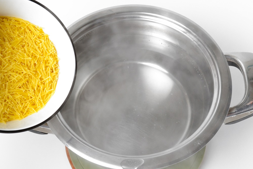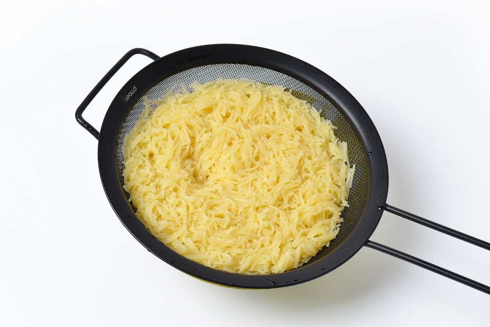 Хорошо перемешать. Довести до кипения и варить 1 минуту. Затем слить воду, используя мелкое сито или дуршлаг, через который не проскочит тонкая вермишель.