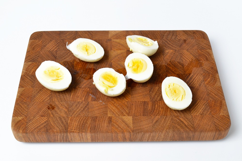 Яйца разрезать пополам – по 2 половинки на порцию.