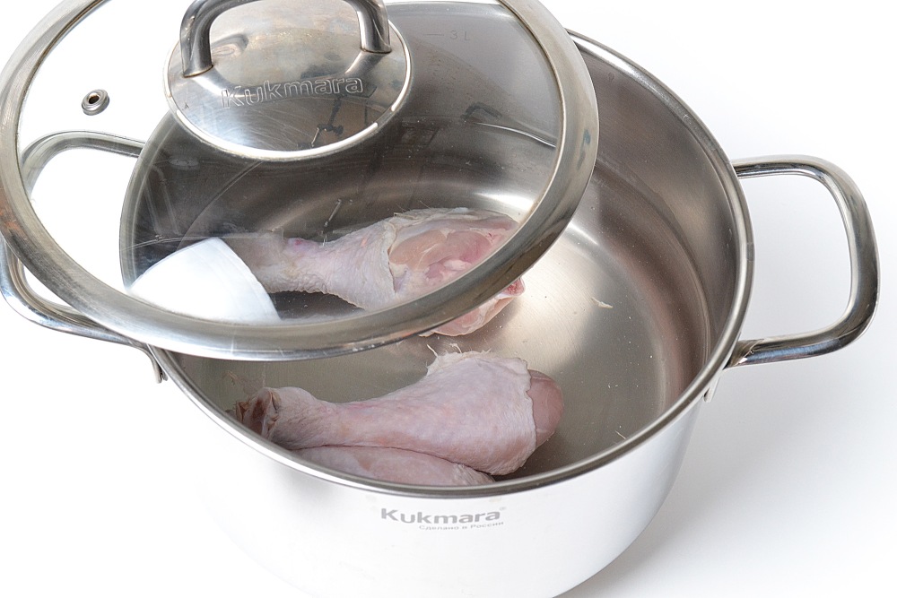 В 3 л кастрюлю (можно взять и 4 л) положить курицу, залить водой так, чтобы она ее едва покрывала. Накрыть крышкой и отправить на плиту.