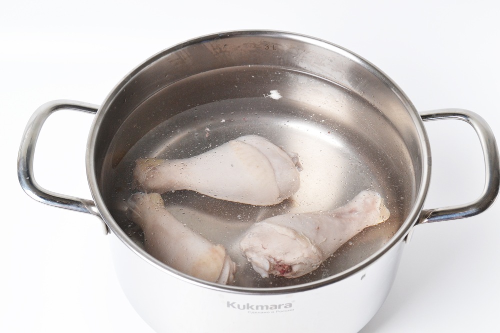 Влить 2,2-2,4 л воды в кастрюлю с курицей и поставить на плиту. Довести до кипения на сильном огне, снизить до среднего или чуть ниже (3/6 для электроплиты) и варить 25 минут при минимальном кипении.