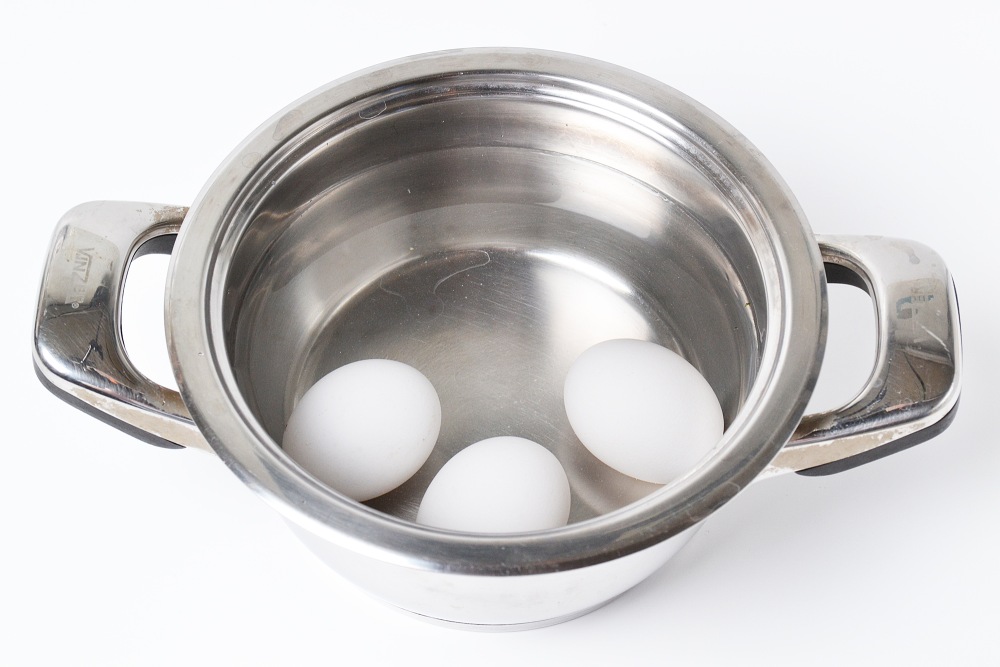 Яйца залить холодной водой в небольшой кастрюле. Поставить на сильный огонь, довести до кипения и снизить мощность (до 4/6 для электроплиты). Варить 5-6 минут. Затем снять, залить холодной водой и оставить остывать.