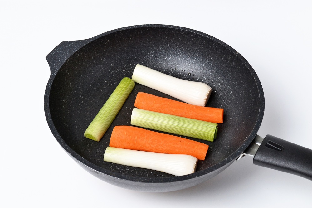 На сухой хорошо разогретой сковороде поджарить овощи до темной корочки. Этот шаг можно пропустить, но подготовленные таким образом овощи дают более яркий аромат бульону.