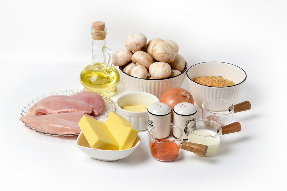 Подготовить ингредиенты: куриное филе, панировочные сухари, сыр, грибы, лук и специи.