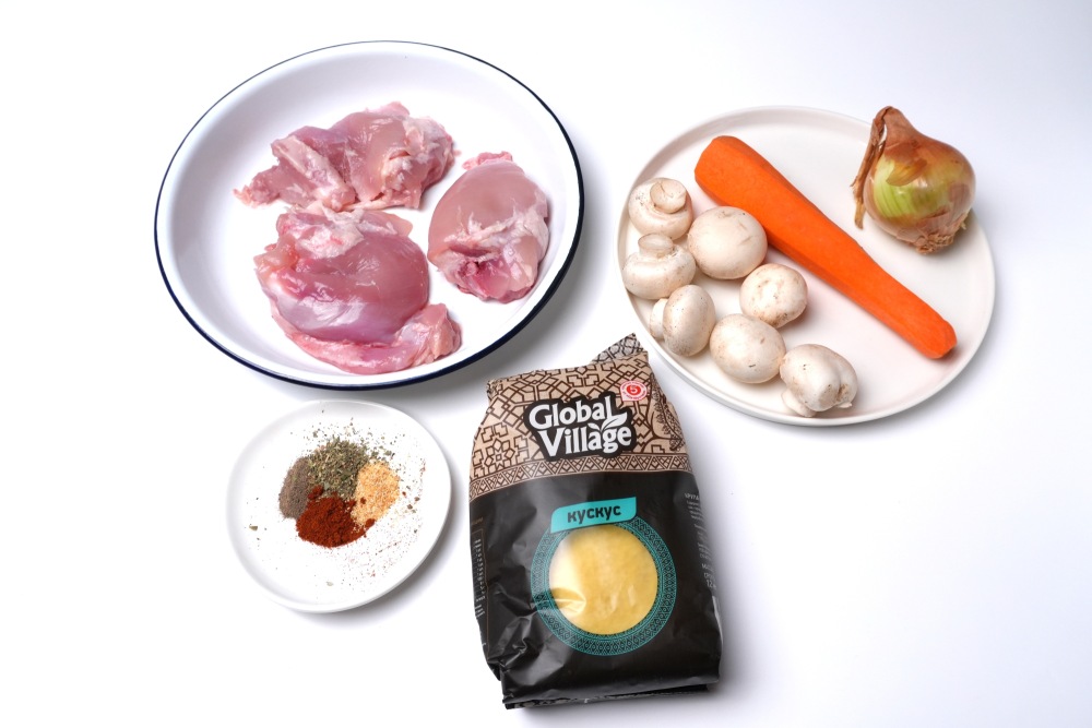 Один из любимых вариантов быстрого обеда, когда не хочется отдельно готовить мясо, отдельно гарнир. В этом рецепте большая вариативность составляющих: вы можете выбрать овощи на ваш вкус, можете заменить мясо на морепродукты, поэкспериментировать с соусами и т.д. Я даю базу, проверенную временем - куриные бедра получаются сочными и сытными, грибы дают свой аромат и текстуру, морковь и лук в доме есть практически всегда, они дают свою сладость, а кускус настолько прост и быстр в приготовлении, что стал незаменим.