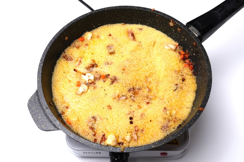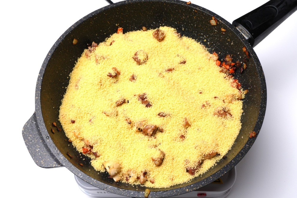Всыпать в сковороду кускус, равномерно распределить лопаткой.