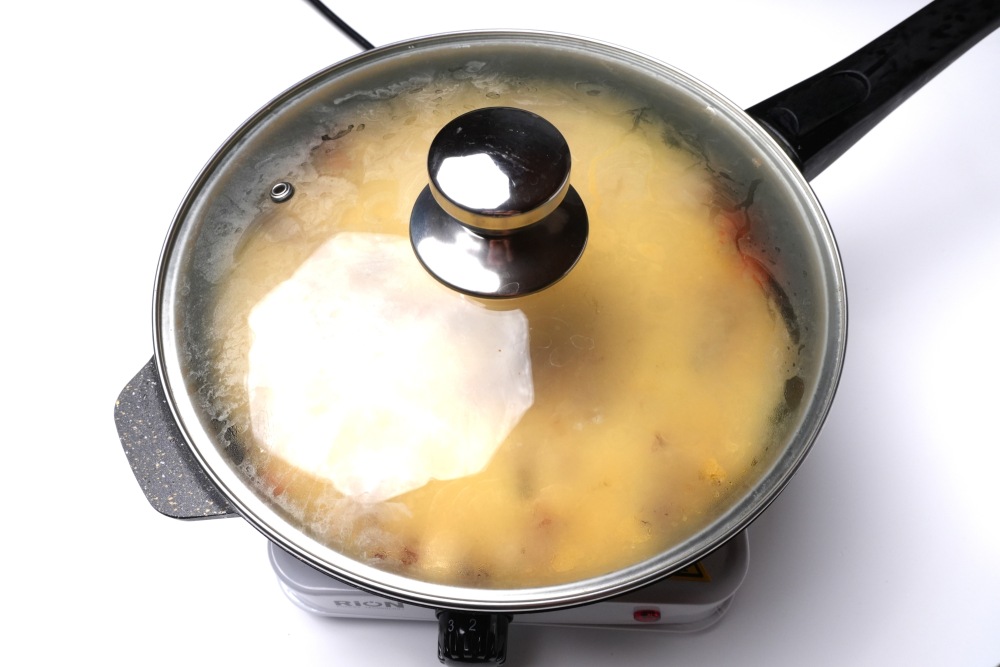 Влить в сковороду стакан теплой воды, огонь убавить до минимального.