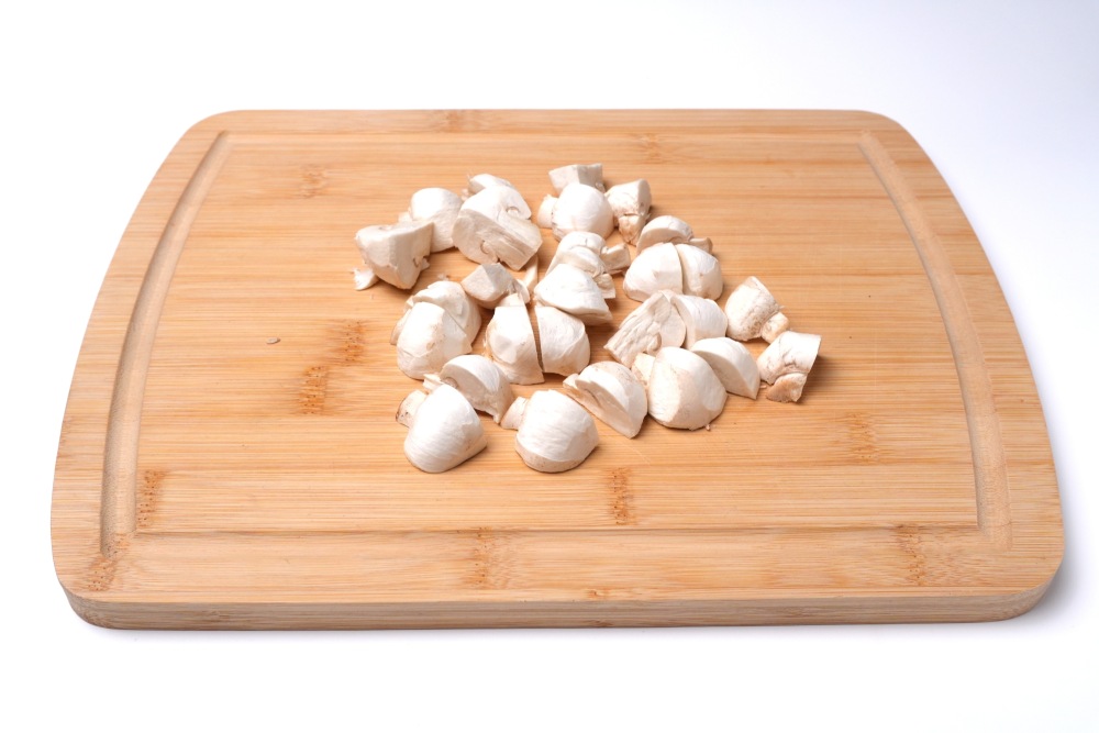 Если грибы большие, нарезать четвертинки еще пополам, если маленькие, достаточно только наполовину. Я не рекомендую мыть шампиньоны, так как они очень быстро впитывают влагу, как губка. Их лучше почистить кисточкой или влажным бумажным полотенцем, либо снять верхний слой.
