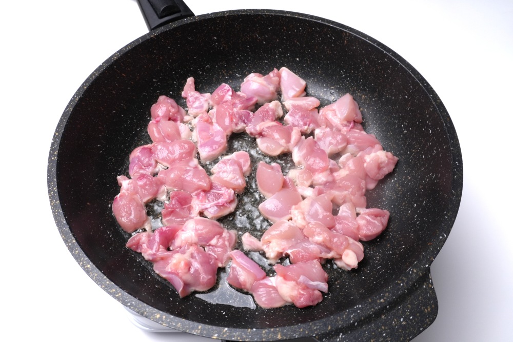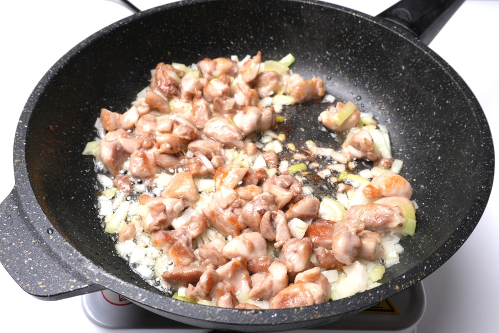 На среднем огне разогреть сковороду с маслом. Отправить обжариваться курицу. Обжаривать до золотистой корочки, помешивая. Это займет около 5 минут.