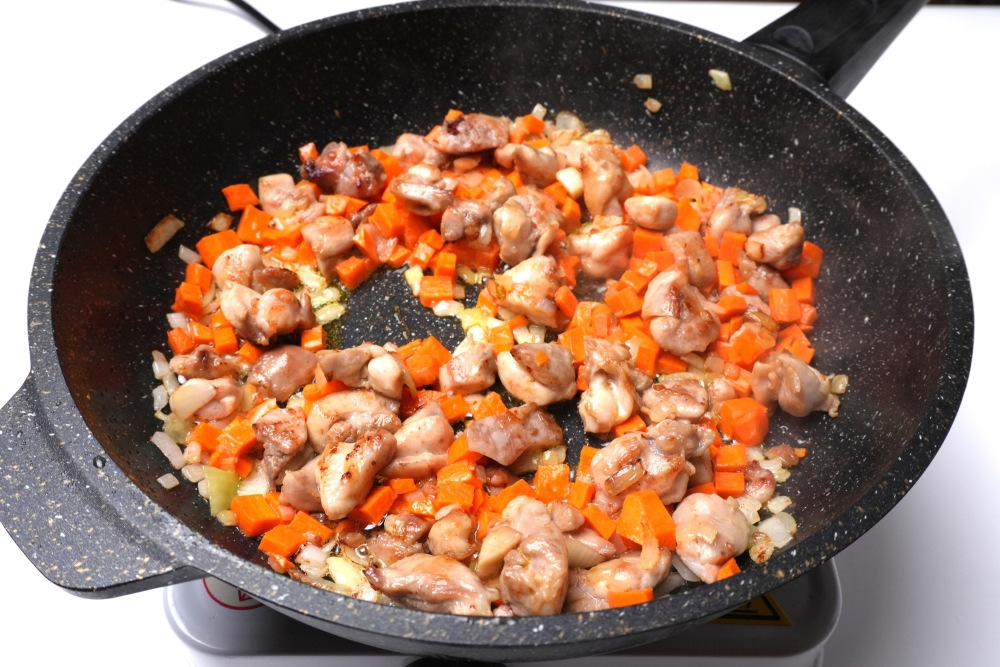 Отправить в сковороду морковь, перемешать и обжарить все вместе еще 3-5 минут.