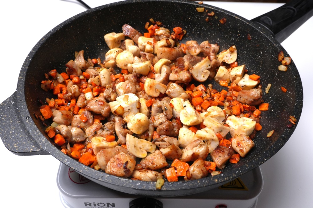 Грибы готовятся быстро, поэтому мы отправляем их в последнюю очередь. Специи тоже нужно добавить именно на этапе обжарки, так они лучше раскроют вкус и аромат.