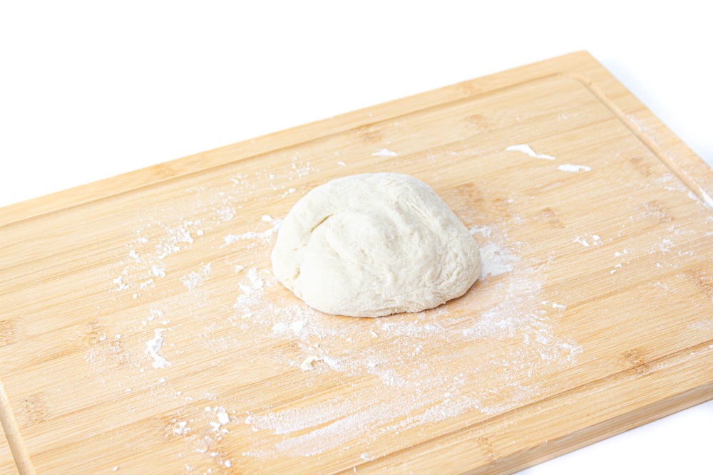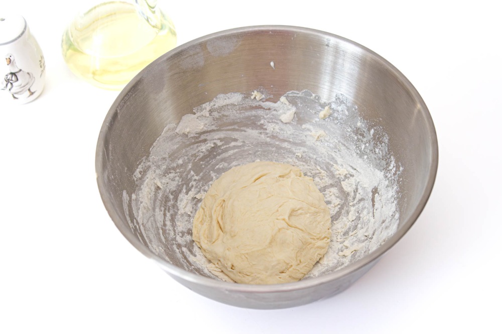 Замесить упругое тесто, скатать в шар. Тесто должно тяжело мяться. Регулируйте количество муки по факту замеса.