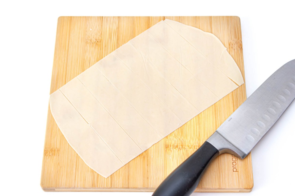 Подсушенные пласты нарезать тонким ножом на полоски шириной в 4 см.