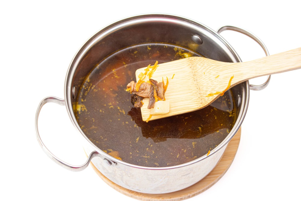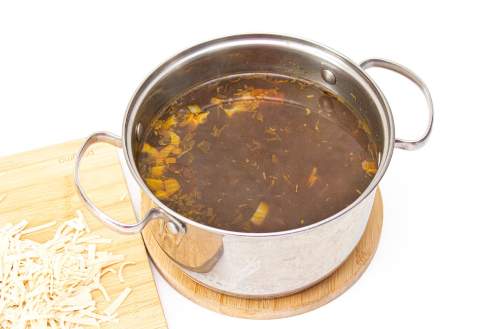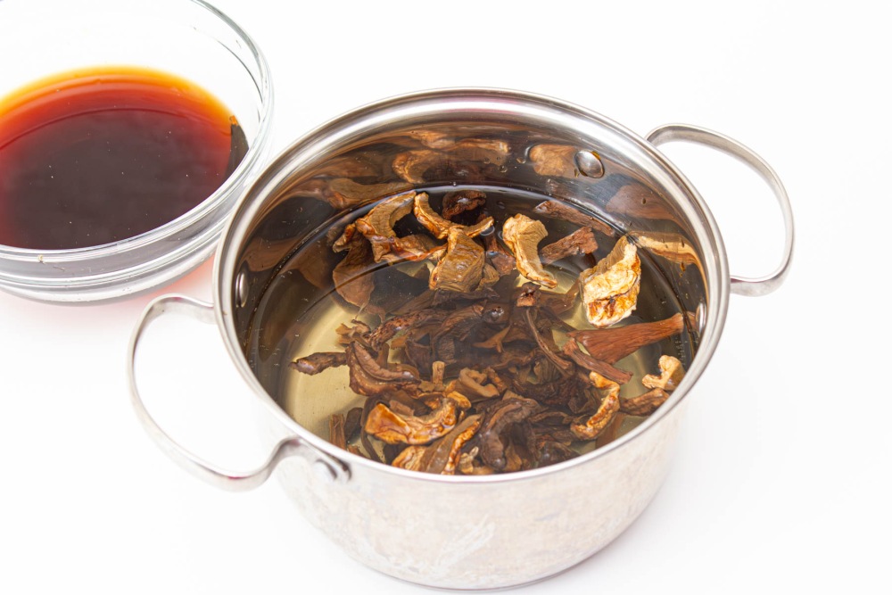 - Сушёные грибы заранее замочите в тёплой воде на час — это ускорит процесс и сделает бульон насыщеннее.