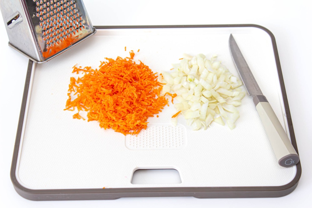 Подготовить овощи для обжарки. Лук и морковь очистить, лук мелко нарезать, морковь натереть на мелкой тёрке.